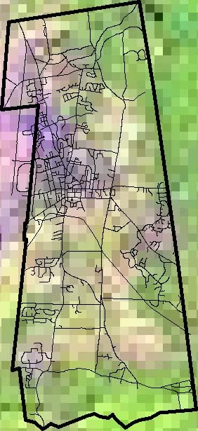 A Landsat 7 satellite image shows warmer areas (purple) and cooler areas (green), with streets added for reference (black).