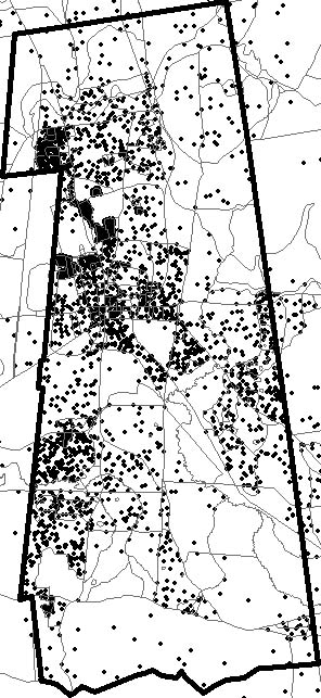 | Census 2000 population. Each dot represents 10 people (distributed randomly within census blocks, also shown). |