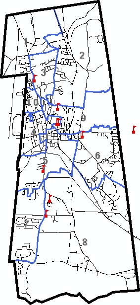 | Streets and railroads, voting precincts (blue), and K-12 schools. |