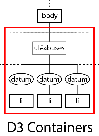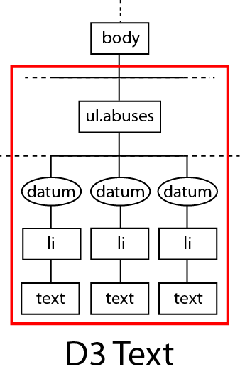 3. Once the D3 selection is set, additional containing elements can be appended to the parents as necessary. To determine how many containing elements are actually required, we attach the list of data to the selection, e.g. the 18 abuses: