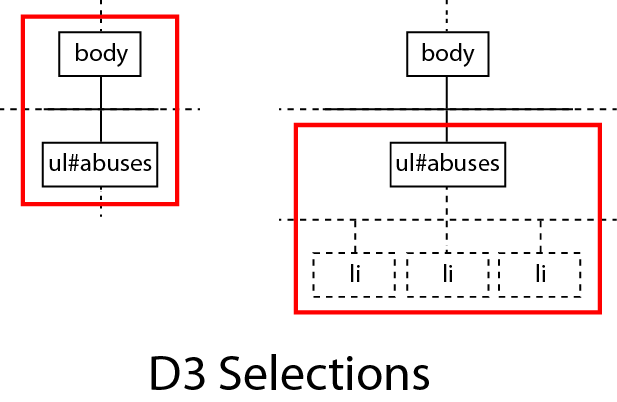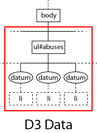 d3.select('ul#abuses')          // Step 1a: Select <ul> element with id #abuses